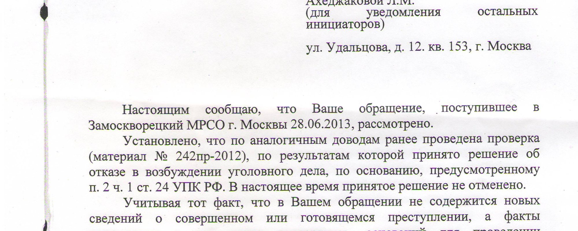 Настоящим сообщаю, что Ваше обращение, поступившее в Замоскворецкий МРСО г. Москвы 28.06.2013, рассмотрено.