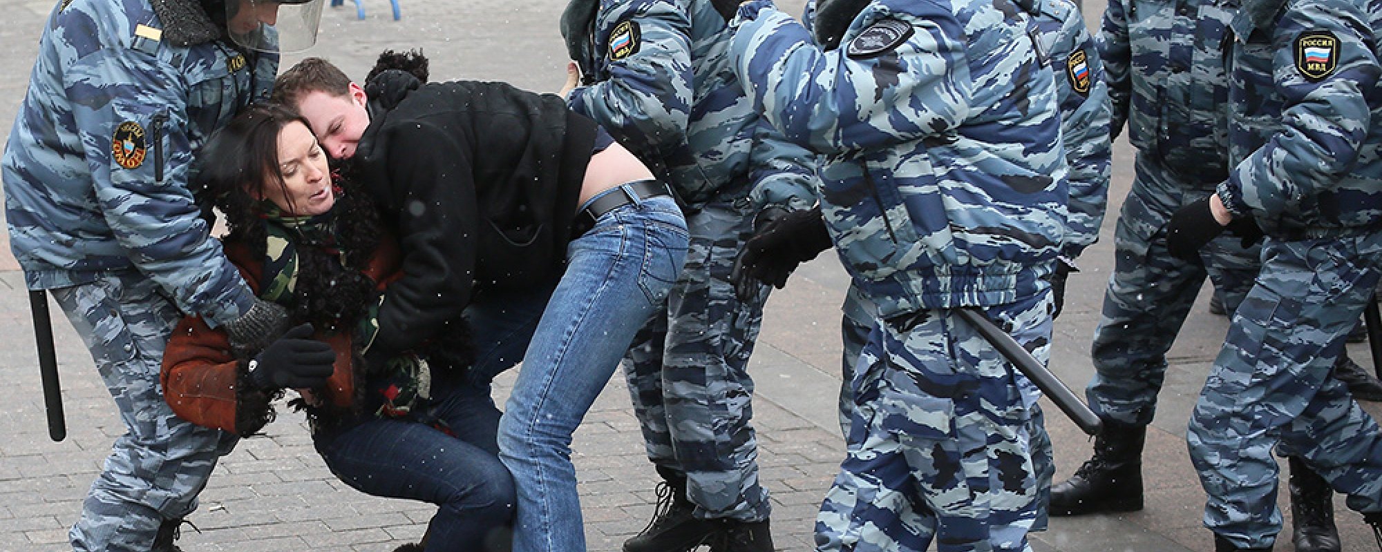 С 15 ч. 30 мин. началось общее скандирование лозунга «Нет войне!», полиция проводила задержание вначале только выкрикивающих граждан, а затем и рядом стоящих. Задержание проходило без использования спецсредств, задержаний с явно чрезмерным применением силы не замечено. Доставляемых в спецтранспорт граждан несли на руках либо вели под руки.