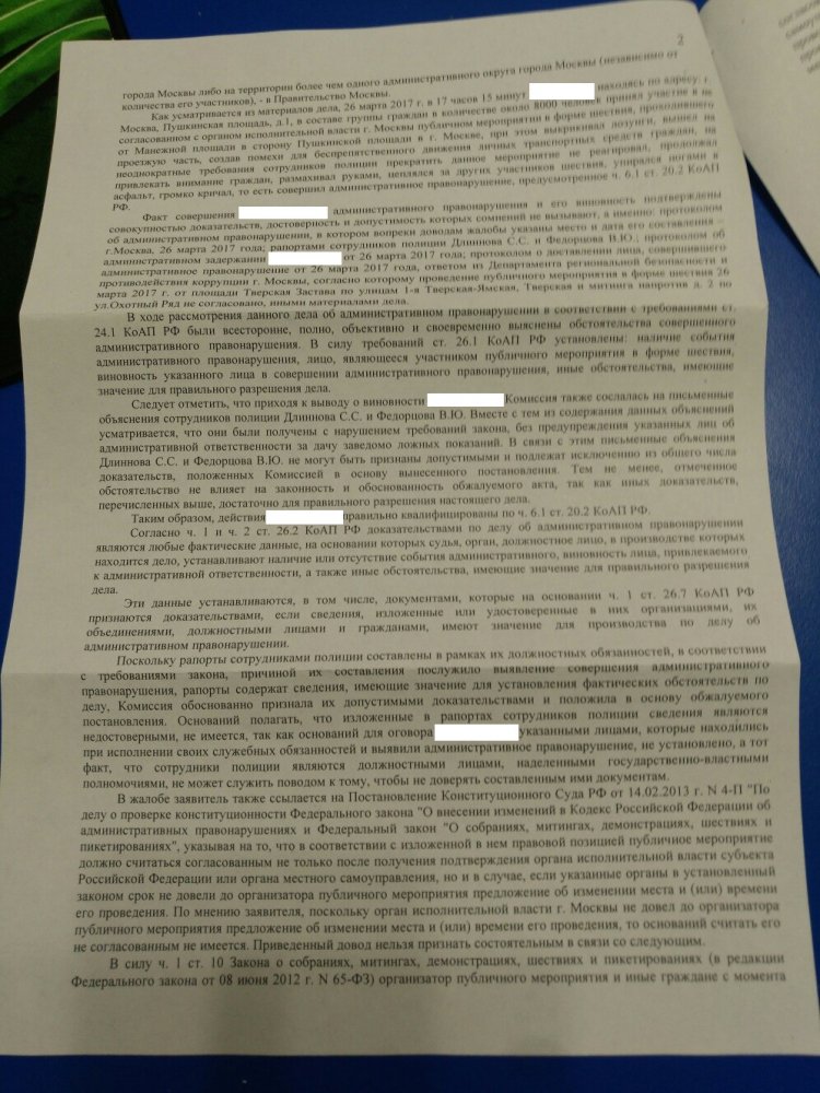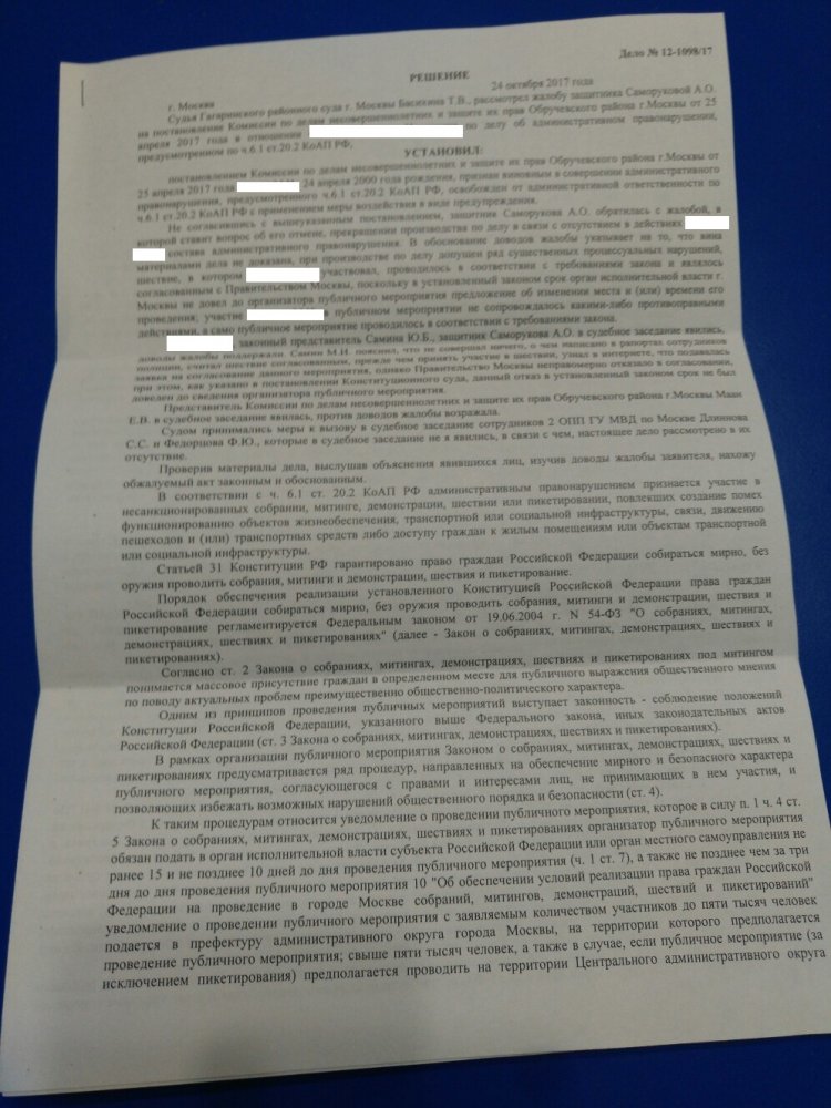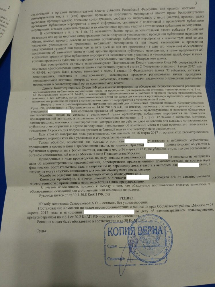 Гагаринский районный суд Москвы оставил в силе решение Комиссии по делам несовершеннолетних по делу одного из задержанных на акции 26 марта. Комиссия посчитала, что задержанный подросток нарушил порядок проведения публичных мероприятий, создав помехи инфраструктуре (ч. 6.1 ст. 20.2 КоАП), но освободила его от ответственности и ограничилась предупреждением. Суд, поддержав Комиссию, неожиданным образом проинтерпретировал положение Конституционного суда.
