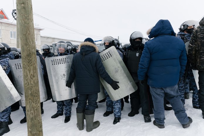 There have been internet outages all over the republic since early morning. In Baymak there is neither internet nor cell service. An hour before the hearing, a busload of Rosgvardiya men pulled up outside the court [Rosgvardiya, short for Russian Guard, is an internal military force that reports directly to Putin]. Police in riot helmets sit inside the courthouse, and two more are on duty nearby. The hearing is scheduled for 9:30.