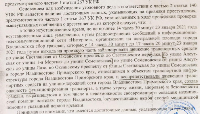 In Vladivostok, according to the Investigative Committee, unidentified persons from the local Navalny office and its coordinator, Ekaterina Vedernikova (Ostapenko) persuaded residents to block the city’s road network via the Internet. Among the accused is Alexey Gasyuk, who allegedly colluded with them, being present at the demonstration on January 23 on Svetlanskaya Street. The charge alleges that Gasyuk was in a mass gathering of people who held hands and obstructed traffic. According to the investigation, Gasyuk prevented the ambulance crew from getting to a seriously ill person, and also by his aggressive behavior created a «real threat to the safety of citizens» and «a real threat of damage to property worth RUB 50,000 <… > located in the store L’Etoile». A similar charge was brought against another resident of Vladivostok. The resolution stated that the roles were assigned to «unidentified persons». According to it, they were supposed to provoke the people to go out on the roadway. The lawyer from OVD-Info Polina Sidelnikova, representing Gasyuk, noted that on the video recordings provided by the investigators, it is clear that the authorities have blocked the road even before the protesters had gone out to the roadway.