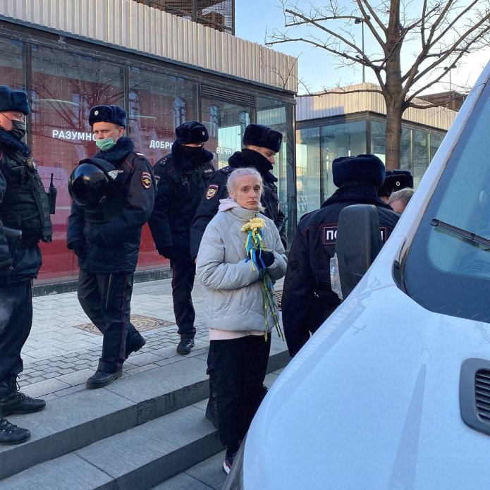Evgenia Isayeva, an artist from St. Petersburg, was fined 45,000 rubles (US$550) for staging an anti-war performance on the steps of the city parliament in St. Petersburg on her birthday in March 2022. The girl poured red paint on herself and repeated «my heart is bleeding» until she was taken away to a police bus. «How can people be judged for thoughts, for words? Everyone has the right to hold their opinion, this is our right under the Constitution, even under the amended one», Isaeva said. «I had a „clean“ record, and I understood I had one chance not to go to prison and say as loudly as possible what I and many others think and feel».
