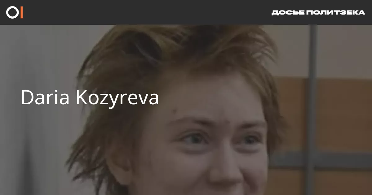 Resident of St. Petersburg. On 19 December 2022, she was detained because she left an inscription on an installation about friendship between St. Petersburg and Ukrainian Mariupol. A report was drawn up on Kozyreva under the administrative article on discrediting the Armed Forces (Article 20.3.3 of the Code of Administrative Offences). However, in January 2023, a criminal case on property damage was initiated, considering that the woman's actions caused significant material damage to the owner of the installation, Bright City LLC: more than 250 thousand rubles "according to the cost of dismantling works and cost of restorative repair and subsequent installation of the light composition." Since then, there have been no investigative actions in this case. In addition, on December 15, 2023, a report was drawn up against Kozyreva under Article 20.3.3 of the Code of Administrative Offences because of a post on VKontakte, which she published on the day when articles on “fake news” about the war (Article 207.3 of the Criminal Code) and discrediting the Armed Forces (Article 280.3 of the Criminal Code) were added to the Criminal Code on 4 March 2022. In the post, Kozyreva spoke about these amendments as well as the imperialist nature of war. On 24 February 2024, the second anniversary of the start of the full-scale invasion of Ukraine, Kozyreva was detained because of a poster with a fragment of text from Shevchenko's poem "Testament" pasted on the monument of Taras Shevchenko. Later it became known that a criminal case on discrediting the Armed Forces was initiated against her. On 27 February, the girl was taken into custody. In August 2024, it became known that another episode appeared in the case of Kozyreva — in connection with her interview with the YouTube channel "Realii." In December 2024, the court referred the case to the prosecutor's office. On 7 February 2025, Kozyreva's preventive measure was replaced with a prohibition of certain actions. In March, the court of appeal overturned the decision to return the case to the prosecutor's office. On 18 April 2025, Kozyreva was sentenced to two years and eight months in a general regime penal colony. Kozyreva's last word in court gave rise to a case under the administrative article on discrediting the army (Article 20.3.3 of the Code of Administrative Offences). She was fined 40,500 rubles.