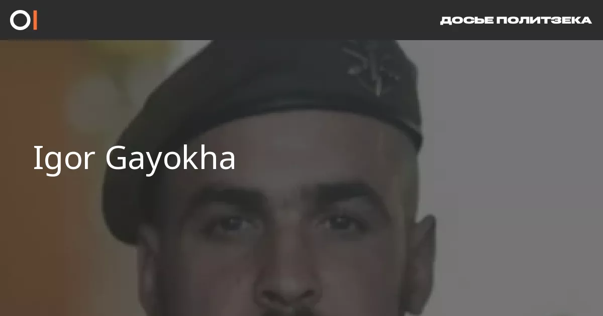 Mortar platoon commander in the Ukrainian "Aidar" battalion. He was seriously wounded on 3 March 2022 — his colleagues believed he was killed. He was taken prisoner (according to his mother, before that he was stripped and tried to be killed, but he survived), he was kept in the occupied territory of Donetsk region of Ukraine: first in hospital, since 13 April - officially in custody. He was charged under a number of articles of the Criminal Code of the self-proclaimed Donetsk People's Republic: the investigation considered him to be one of the organisers of the activities of a terrorist organisation. After the Russian Federation declared the DPR part of its territory, the charges were reclassified in accordance with the Criminal Code of the Russian Federation: Gayokha was accused of participating in the activities of a terrorist organization, violently seizing power, and undergoing training for the purpose of carrying out terrorist activities. Human rights activists note that he is a prisoner of war, so he should not have been prosecuted for participating in hostilities, and furthermore, they consider the charges absurd. On 17 October 2025, Gayokha was sentenced to 18 years in a strict regime colony.