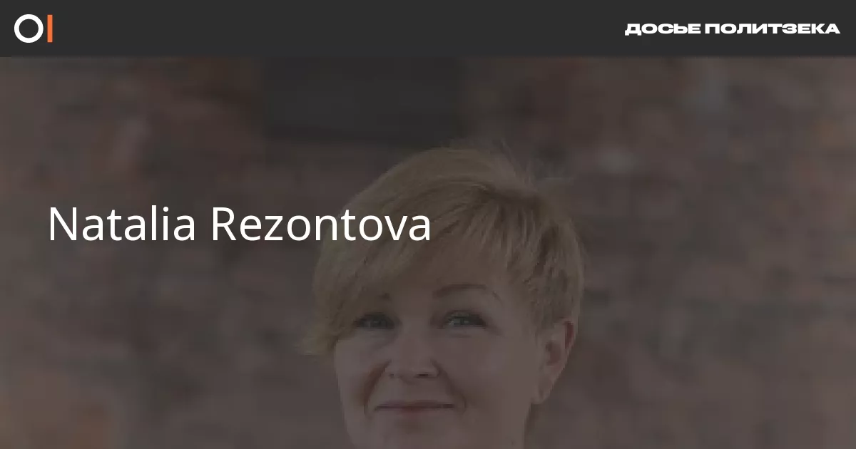 Journalist, tour guide, editor, amateur artist. In 2020, she came second in the election to the City Duma from Yabloko, losing in her district to a candidate from United Russia. On 30 January 2021, Rezontova's home was searched in a case of violation of sanitary and epidemiological rules in connection with an action in support of Alexei Navalny on 23 January. On 1 March Rezontova was charged, the next day a preventive measure was chosen in the form of a prohibition of certain actions. On 24 March 2022 Rezontova's preventive measure was toughened by placing her under house arrest. On 12 August, she was again ordered to prohibit certain actions. On 14 November Rezontova was sentenced to one and a half years of restrictions on freedom.