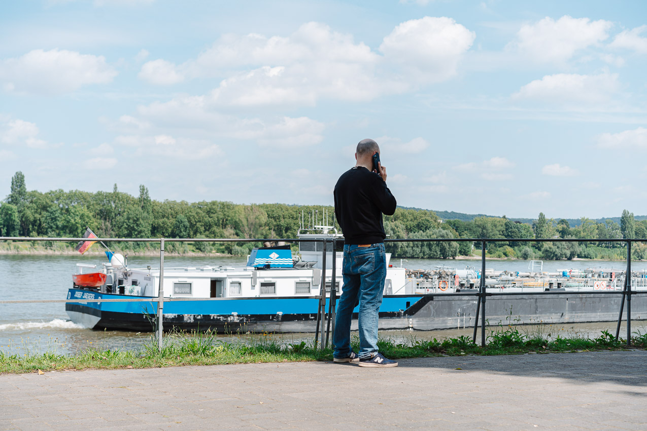 We stop by a cafe on the banks of the Rhine. Andrei gets himself a coffee.