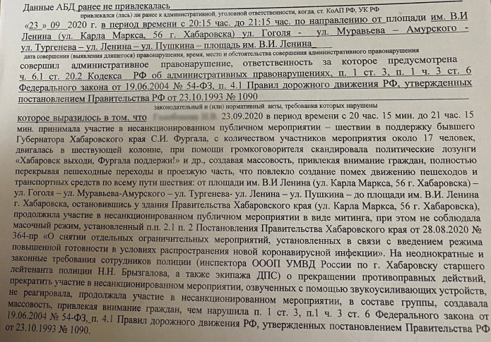 According to an administrative offence report, one of the protesters has been charged with «participating in an unauthorised public event in the form of a march of about 17 people in support of the former Khabarovsk Krai governor Sergei Furgal, moving with a marching column, chanting political slogans ‘Khabarovsk come out, support Furgal, ’ etc., using a loudspeaker, contributing to mass participation, attracting attention, completely obstructing pedestrian crossings and the roadway, from 8.15 pm to 9.15 pm <…>» on September 23.»