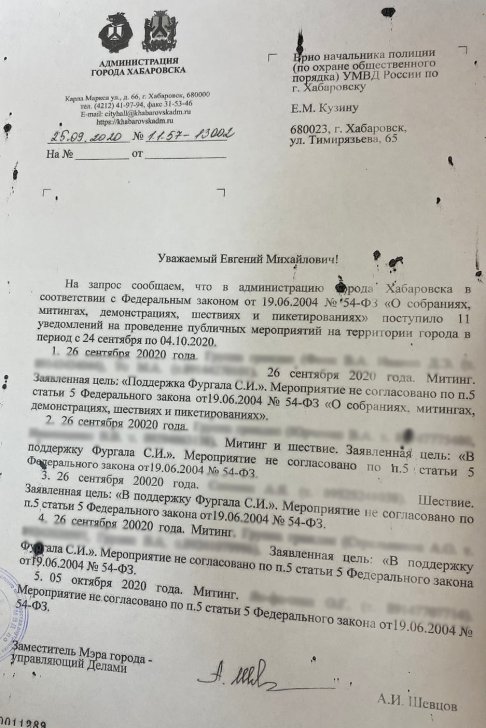 Subsequent attempts to obtain approval for a public event from the city authorities in Khabarovsk also frequently proved to be unsuccessful. From September 24 to October 4, 2020, Khabarovsk City Hall received 11 notifications regarding public events, and in all cases, the organizers received refusals citing Article 5, paragraph 5 of the Federal Law on Assemblies: «The organiser of the public event shall have no right to hold it if the notice of holding the public event was not filed in due time or no agreement was reached with the executive authority of the subject of the Russian Federation or local self-government body as to the alteration at their motivated proposal of the place and/or time of holding the public event.»
