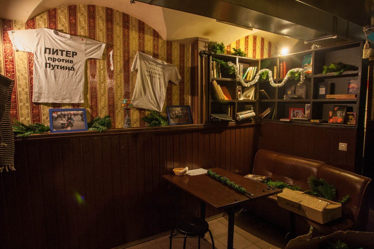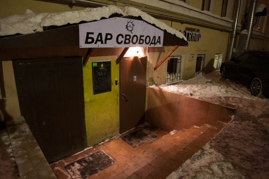 In the Freedom bar, visitors were greeted by portraits of Che Guevara and banners demanding fair elections or Nemtsov’s books, and could order Proletarian beer and a Greedy cocktail, nicknamed after the then governor of St. Petersburg Georgy Poltavchenko. And the password from the WiFi was putinvor («Putin is a thief»). Lectures, discussions and debates took place in this space. The pro-government «Young Guard of United Russia» would send sent underage activists there to buy alcohol and discredit the bar.