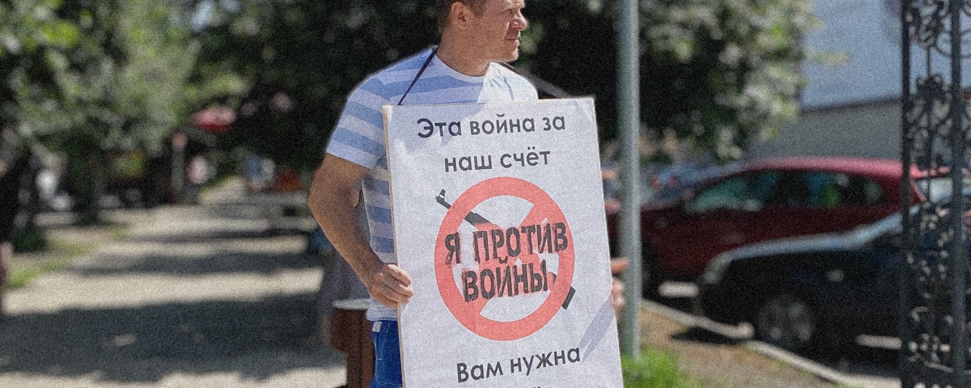 Title Image: Nikolai Borisov holding a «This war is at our expense. I am against war. Do you need this war?» sign at a solitary protest in Voronezh, 7 July 2023 / Photo courtesy of Nikolai’s acquaintances.