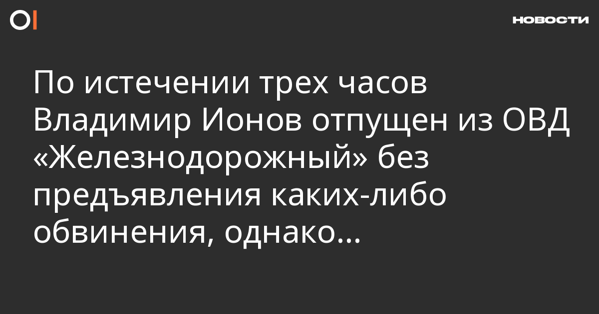 По истечении трех часов Владимир Ионов отпущен из ОВД «Железнодорожный» без предъявления каких-либо обвинения, однако полиция, призвав на помощь понятых, конфисковала у Ионова плакат «Путин — источник опасности».