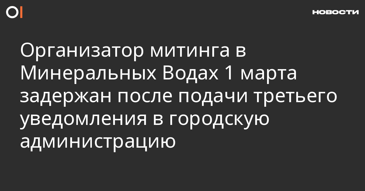 Организатор протестного митинга в Минеральных Водах 1 марта Михаил Назаренко задержан сразу после выхода из здания городской администрации, куда он относил третье уведомление о проведении мероприятия. Об этом Назаренко сообщил на своей странице в «Одноклассниках». Как рассказал ОВД-Инфо местный активист Михаил Савостин, Назаренко днем ранее должны были дать ответ на предыдущее уведомление, но он ничего не получил и поэтому 20 февраля понес в администрацию новое. В настоящее время ни один телефон Назаренко не отвечает.