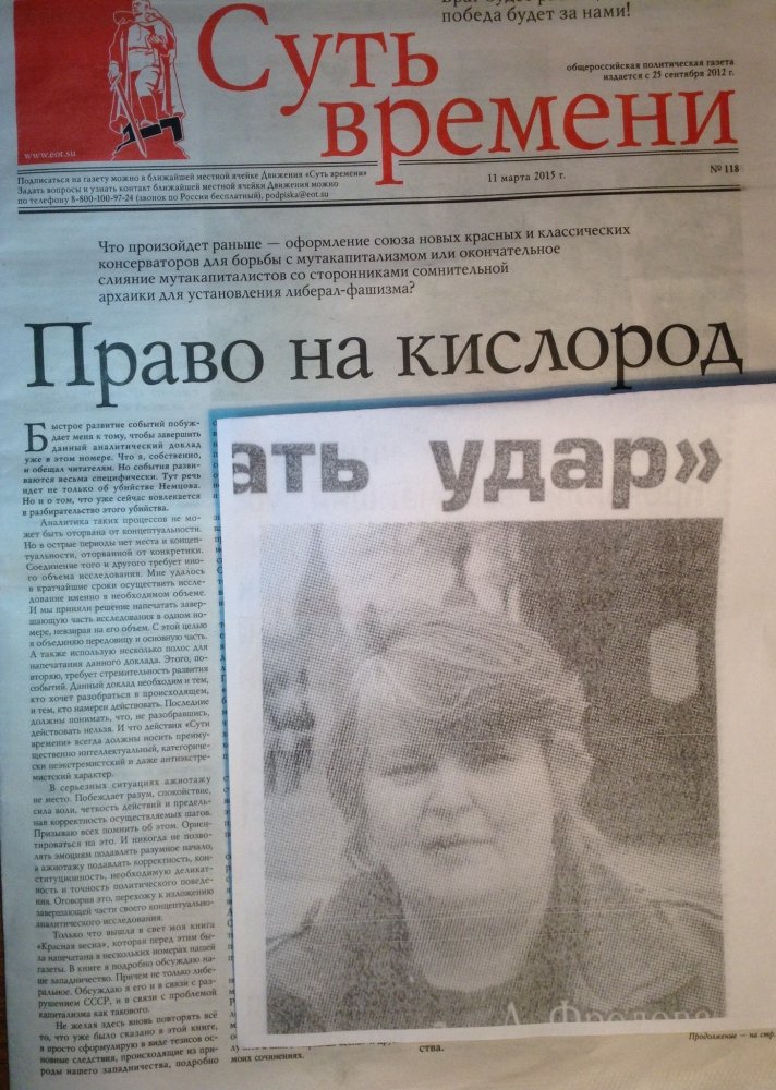 Гражданской активистке и координатору движения «Вместе — за достойную медицину!» Алле Фроловой подбросили в почтовый ящик газету «Суть времени» одноименного лево-патриотического движения, возглавляемого Сергеем Кургиняном. В газету была вложена фотография Фроловой, над фотографией написано слово «удар» (фотография и слово взяты из интервью Фроловой на сайте партии «РОТ-Фронт» под заголовком «Алла Фролова: „Нас давят — приходится держать удар“»). Фролова воспринимает случившееся как угрозу. Газету с фотографией она обнаружила 31 марта.