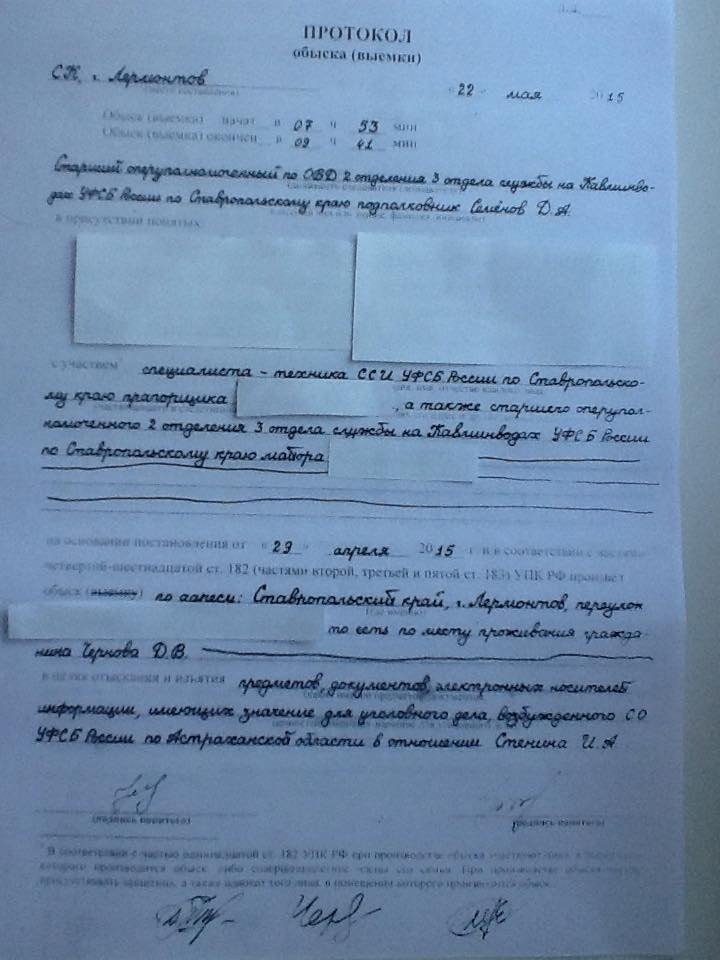 В разных городах прошли обыски, связанные с делом «Русских Астрахани». Один из лидеров организации «Ставропольское вече Руси» Дмитрий Чернов из города Лермонтова (Ставропольский край), у которого прошел обыск, рассказал ОВД-Инфо, что обыски прошли, помимо него, как минимум у пяти человек. Среди городов он назвал Петербург (здесь обыск прошел у Оксаны Борисовой, известной в интернете как Оксана Вёльва), Ставрополь, Самару, Волгоград (позднее стало известно, что в Волгограде обыск прошел у активиста Анатолия Болтыхова), а также город Лиман Астраханской области. По неподтвержденным данным, всего обыски прошли у десяти активистов — по крайней мере еще у пяти человек внезапно отключилась связь. Все они были администраторами группы «Русские Астрахани» в соцсети «ВКонтакте», однако членами организации не являлись. По словам Чернова, активистов спрашивали, публиковался ли в группе контент, призывающий к свержению конституционного строя. Спрашивали, знают ли они лидеров националистического движения «Русские» Дмитрия Демушкина и Александра Белова (в настоящее время под стражей). Кроме того, у Чернова спрашивали о прошедшем 21 мая Дне вышиванки. По его словам, это было не политическое мероприятие: «Люди собрались в лесу, попили чай на природе, велась фото- и видеосъемка». Всего в мероприятии участвовали 35 человек. Сотрудники изъяли все материалы, связанные с этим мероприятием, которые участники не собирались скрывать: по словам Чернова, они как раз собирались выложить видео на YouTube.