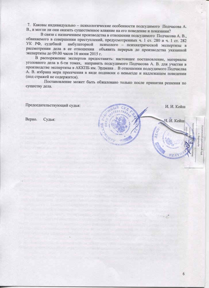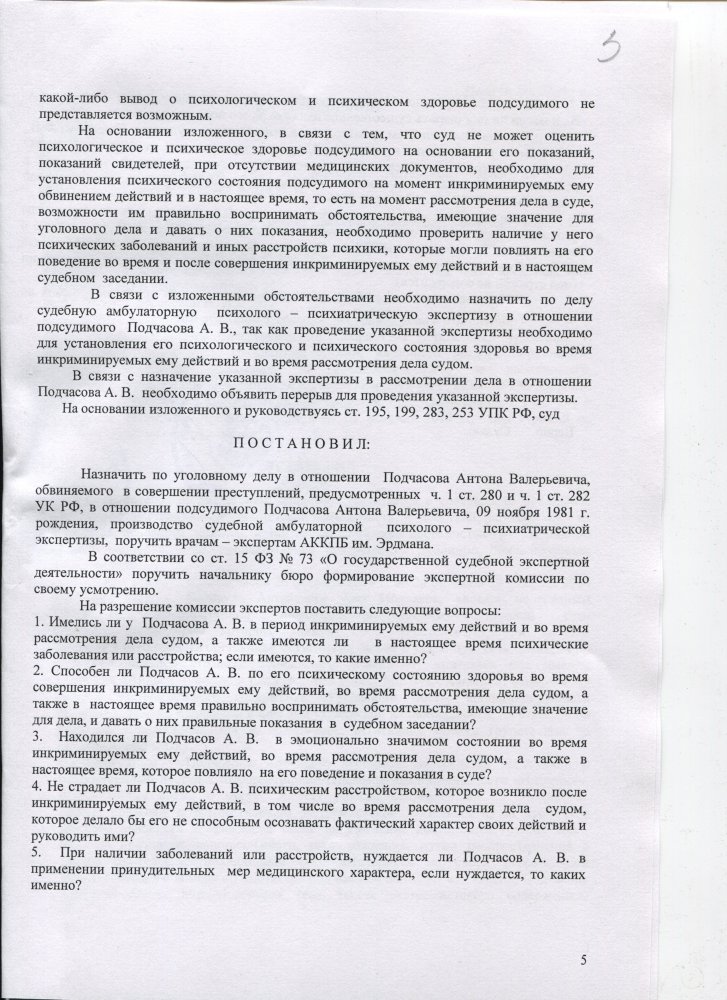 О направлении Подчасова на экспертизу ходатайствовала прокурор, у которой сомнения во вменяемости подсудимого возникли в связи с тем, что он выразил несогласие с результатом лингвистической экспертизы текста, не имея специального образования. Прокурор также отметила, что Подчасов был наблюдателем на выборах, не имея юридического образования.