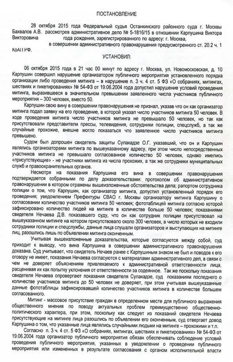Организатор митинга против платных парковок, прошедшего 6 октября на северо-востоке Москвы, оштрафован по решению Останкинского районного суда на десять тысяч рублей. Суд посчитал, что Виктор Карпушин совершил правонарушение, предусмотренное 1-й частью ст. 20.2 КоАП (нарушение организатором публичного мероприятия установленного порядка организации либо проведения собрания, митинга, демонстрации, шествия или пикетирования).