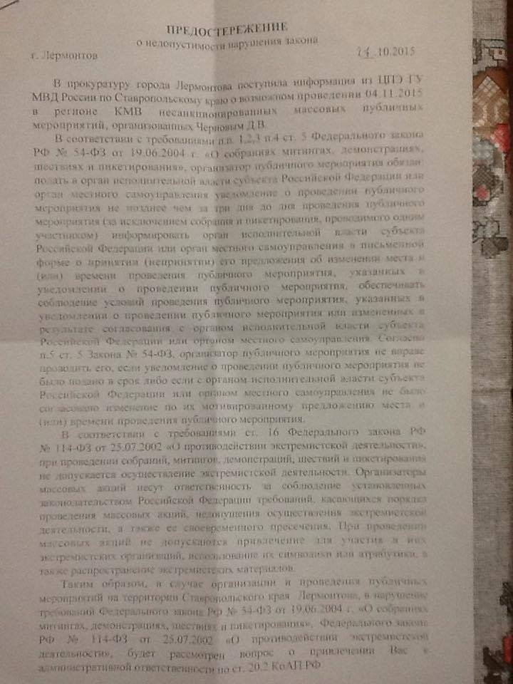 Один из лидеров организации «Ставропольское вече Руси» Дмитрий Чернов, так же, как и Болтыхов, являющийся координатором Международного правозащитного альянса, рассказал ОВД-Инфо, что получил от прокуратуры предостережение о недопустимости проведения несогласованных мероприятий. Чернов предположил, что за этим последует задержание, и был вынужден на время уехать в Киев.