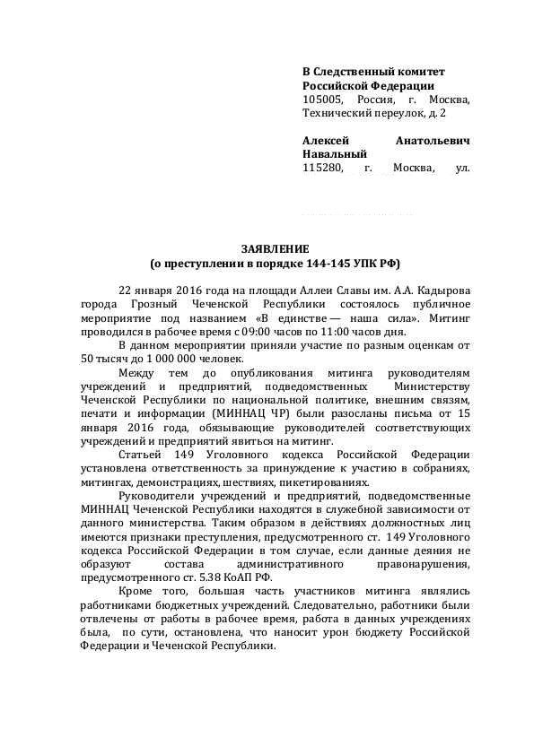 Основатель Фонда борьбы с коррупцией Алексей Навальный обратился в Следственный комитет с заявлением на принуждение бюджетников участвовать в митинге в Чечне. Копию заявления политик опубликовал вечером 22 января на своем сайте.