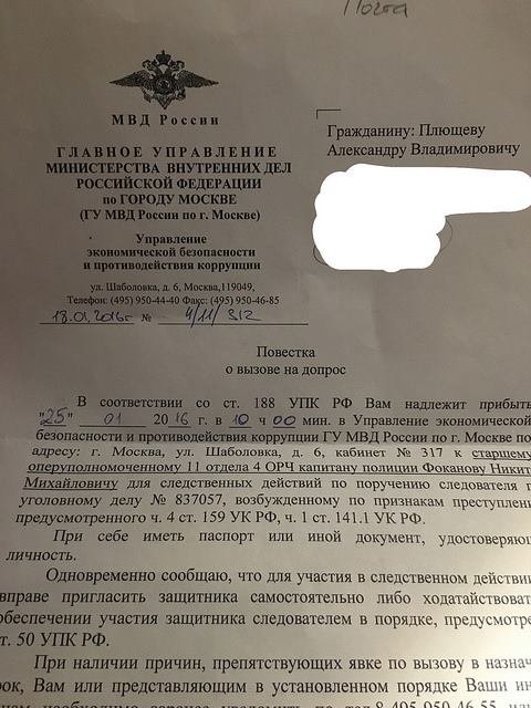 Сотрудник «Эха Москвы» Александр Плющев был вызван в Следственный комитет на допрос по делу о мошенничестве в ходе избирательной кампании Алексея Навального. Журналист сообщил в Facebook, что во врученной ему повестке было указано 25 января, однако повестку он получил поздно и договорился, что явится на допрос 26 января.