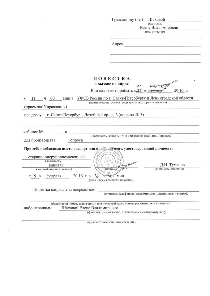 Председателю организации «Гражданский контроль» Елене Шаховой и ее заместителю Марии Разумовской вручили повестки в ФСБ. В документе, который был вручен Шаховой, сказано, что ей надлежит явиться в местное управление ФСБ «для производства опроса», без каких-либо уточнений. Изначально Шахова была вызвана на 25 февраля, но в связи с ее занятостью встреча была перенесена на 1 марта