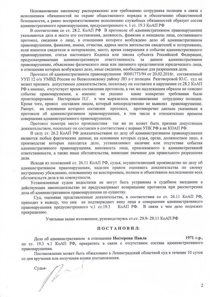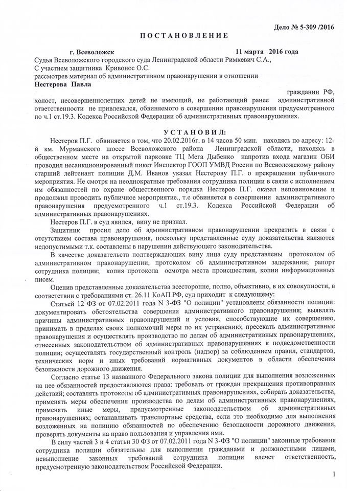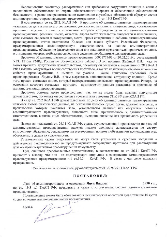 Двоим последним также вменялось неповиновение законным требованиям сотрудников полиции (ч. 1 ст. 19.3 КоАП), но производство по этой статье в отношении обоих было прекращено.