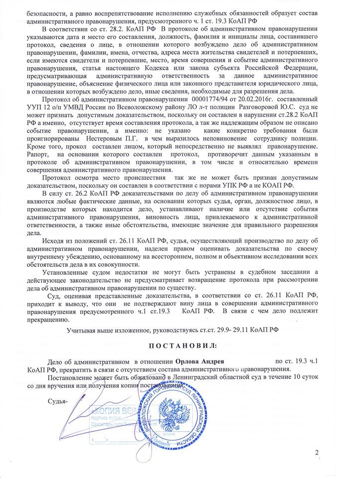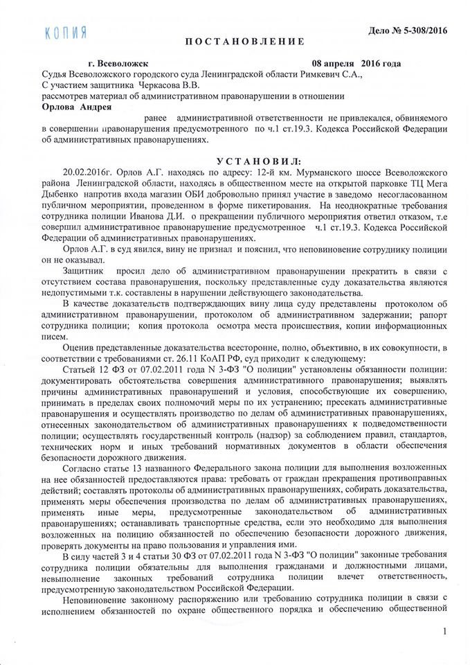 Всеволожский городской суд оштрафовал Андрея Орлова, задержанного вместе с петербургскими дальнобойщиками 20 февраля возле торгового центра «МЕГА-Дыбенко» на окраине Петербурга, на пять тысяч рублей. На Орлова, как и на других задержанных, были составлены протоколы по ч. 2 ст. 20.2 и ст. 19.3 КоАП. Как рассказал ОВД-Инфо адвокат Валентин Пышкин, представляющий интересы Орлова, суд переквалифицировал Орлову обвинение с организации несогласованного мероприятия на участие (ч. 5 ст. 20.2 КоАП), а дело о неповиновении законным требованиям сотрудников полиции закрыл в связи с отсутствием правонарушения.