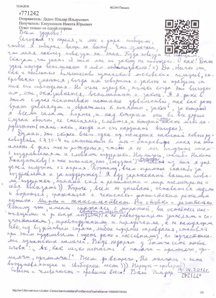 14 апреля у Дадина был день рожденья. В опубликованном «РосУзником» письме Дадин рассказывает о том, что утром 14 апреля ему велели собирать вещи «на выход». Он отмечает: «Думаю, это скорее всего одна из последних пакостей нового руководства СИЗО-4 по отношению ко мне — отправить меня на этап именно в день моего рождения, чтобы не мог получить писем с поздравлениям и словами поддержки».