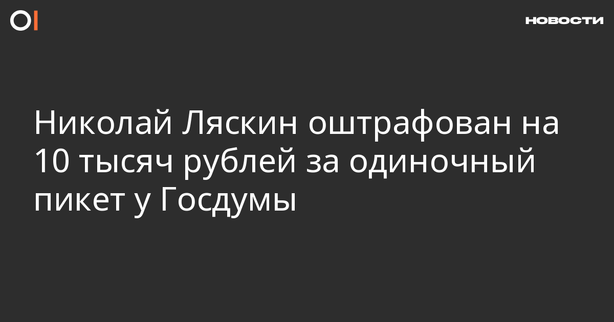 Глава московского отделения Партии Прогресса Николай Ляскин, задержанный 5 апреля во время серии одиночных пикетов у Госдумы с требованием импичмента Владимира Путина в связи с публикациями по материалам «Панамского архива», 20 апреля был признан виновным в нарушении установленного порядка проведения митинга и оштрафован на 10 тысяч рублей. Об этом сообщает пресс-секретарь Ляскина Елена Слесарева.