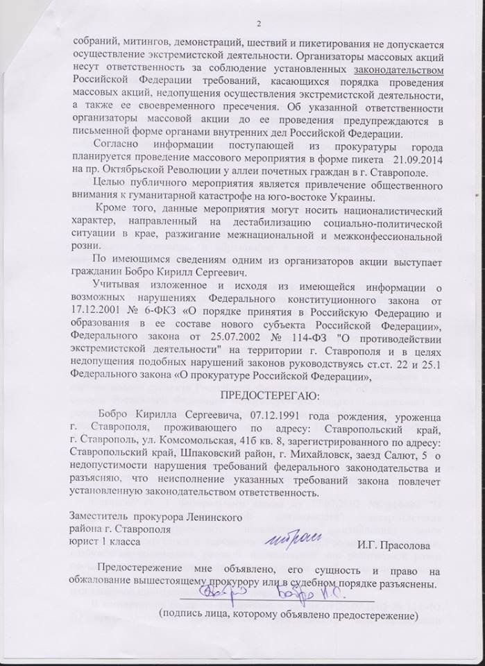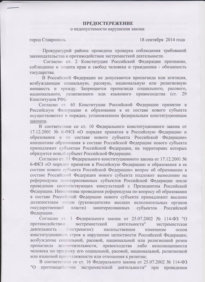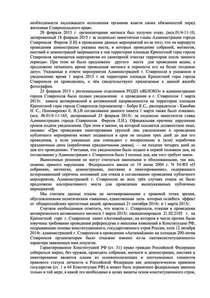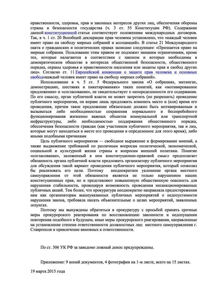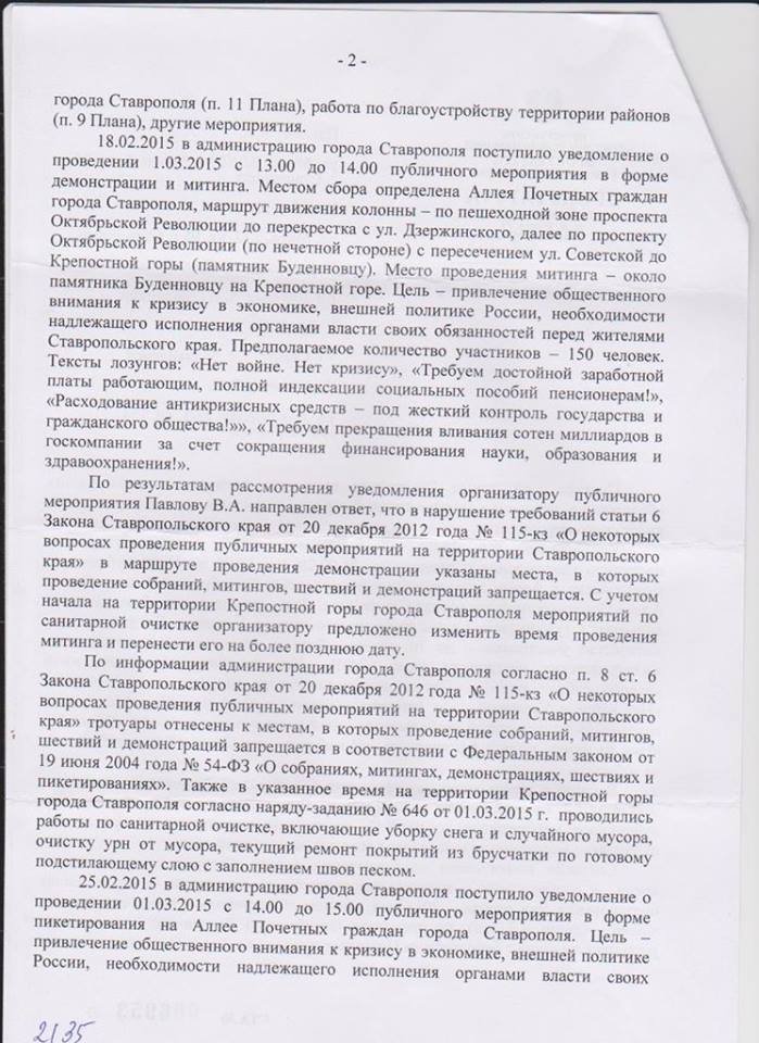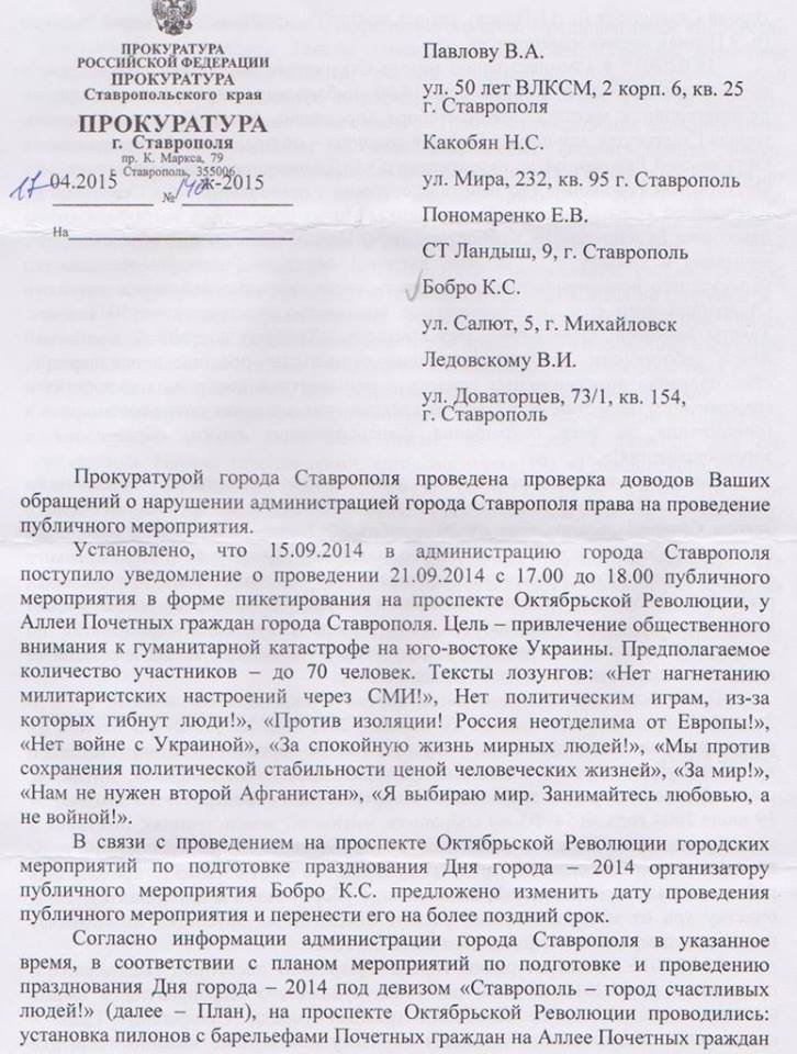 18 мая Ленинский районный суд Ставрополя отклонил иск пятерых местных активистов к прокуратуре, не нашедшей нарушений в отказах городской администрации в согласовании трех акций. Речь шла о пикете против военных действий на юго-востоке Украины, запланированном на 21 сентября 2014 года, о демонстрации и митинге, которые планировалось провести 18 февраля 2015 года в рамках акции «Антикризисный марш „Весна“», и о протестном пикете, намеченном на 1 марта.