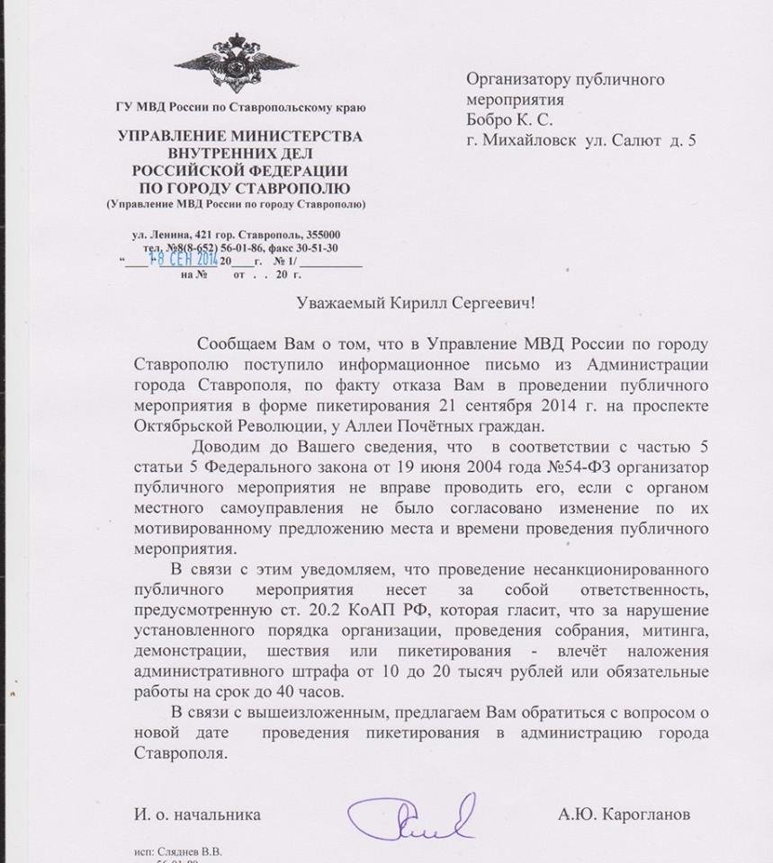 В согласовании мероприятия 21 сентября 2014 года было отказано «в связи с проведением на проспекте Октябрьской Революции городских мероприятий по подготовке празднования Дня города», и 18 сентября главному заявителю, активисту «Яблока» Кириллу Бобро вручили предостережение, кроме того, всем заявителям звонили и просили подтвердить, что они не будут ничего проводить без согласования, рассказала Какобян.