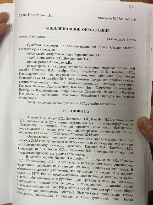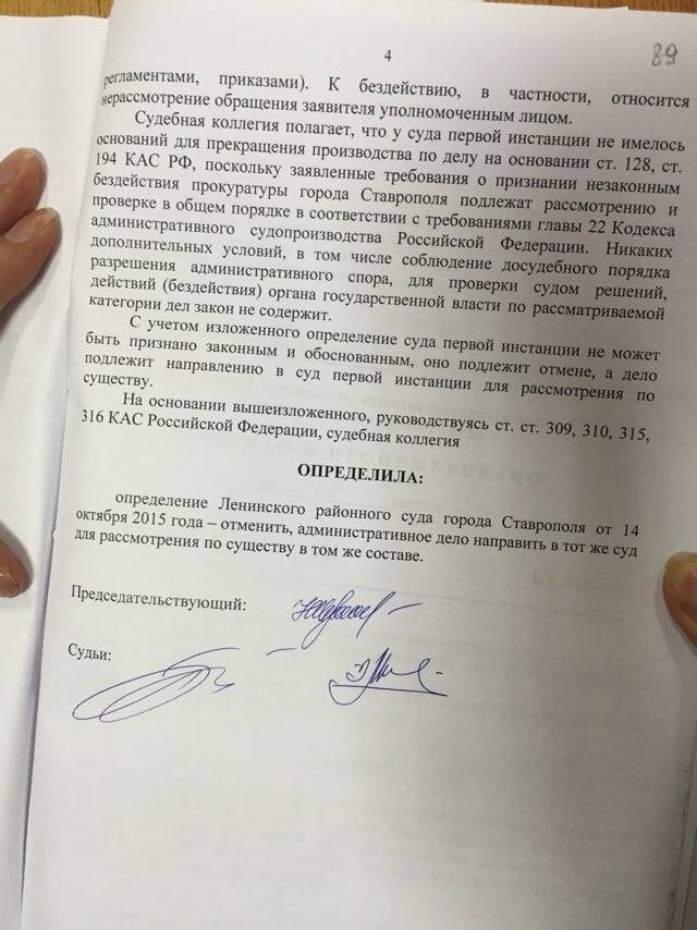 В первый раз иск к прокуратуре был подан осенью 2015 года. 14 октября активистам отказали в удовлетворении иска: Ленинский районный суд посчитал, что истцы «не вправе предъявлять самостоятельные требования о признании незаконными бездействия прокуратуры города Ставрополя на их обращение без соответствующего оспаривания в судебном порядке решений органа местного самоуправления». Они оспорили решение суда в краевом суде, который 14 января 2016 года отменил это постановление и направил дело обратно. Однако 18 мая Ленинский районный суд принял решение, аналогичное принятому в первый раз.