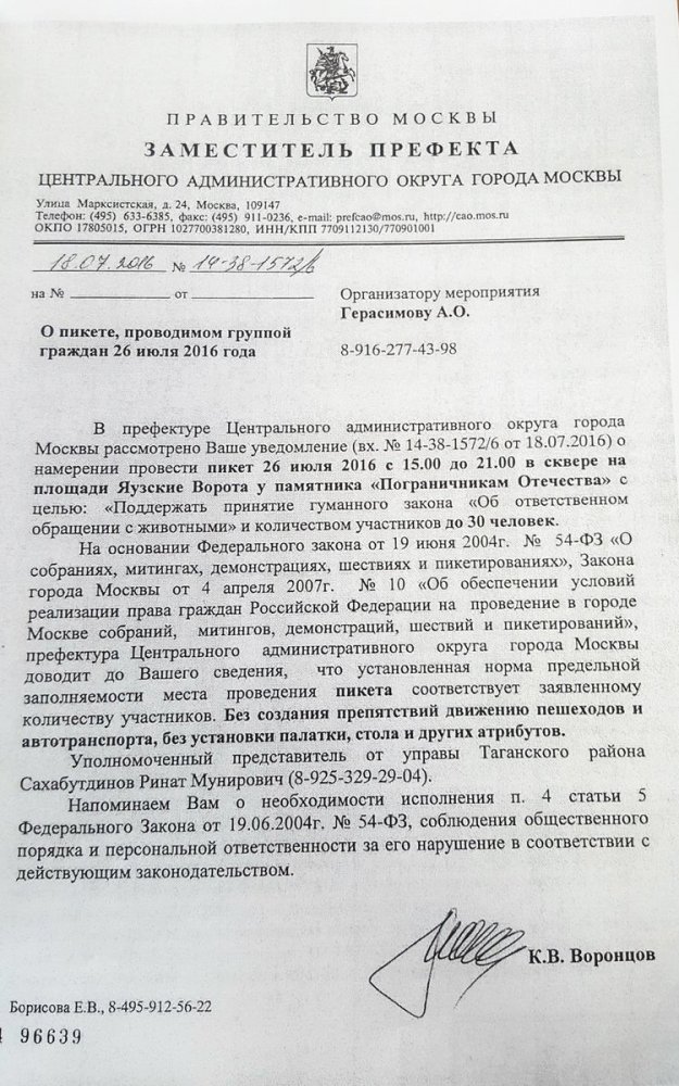 Ранее стало известно о том, что департамент региональной безопасности московской мэрии объявил уже согласованную ранее акцию незаконной. Мэрия сообщила, что на площади Яузские ворота — площадке, которую она сама же и предложила организаторам митинга против «пакета Яровой», будет проводиться пикет численностью до 30 человек с требованием принять закон об ответственном обращении с животными. Несмотря на требование законодательства, альтернативного места для проведения акции мэрия организаторам не предложила. На суде представитель мэрии заявил, что в Москве нет места для проведения митинга численностью 2000 человек, объяснив это тем, что в городе проводятся различные фестивали.