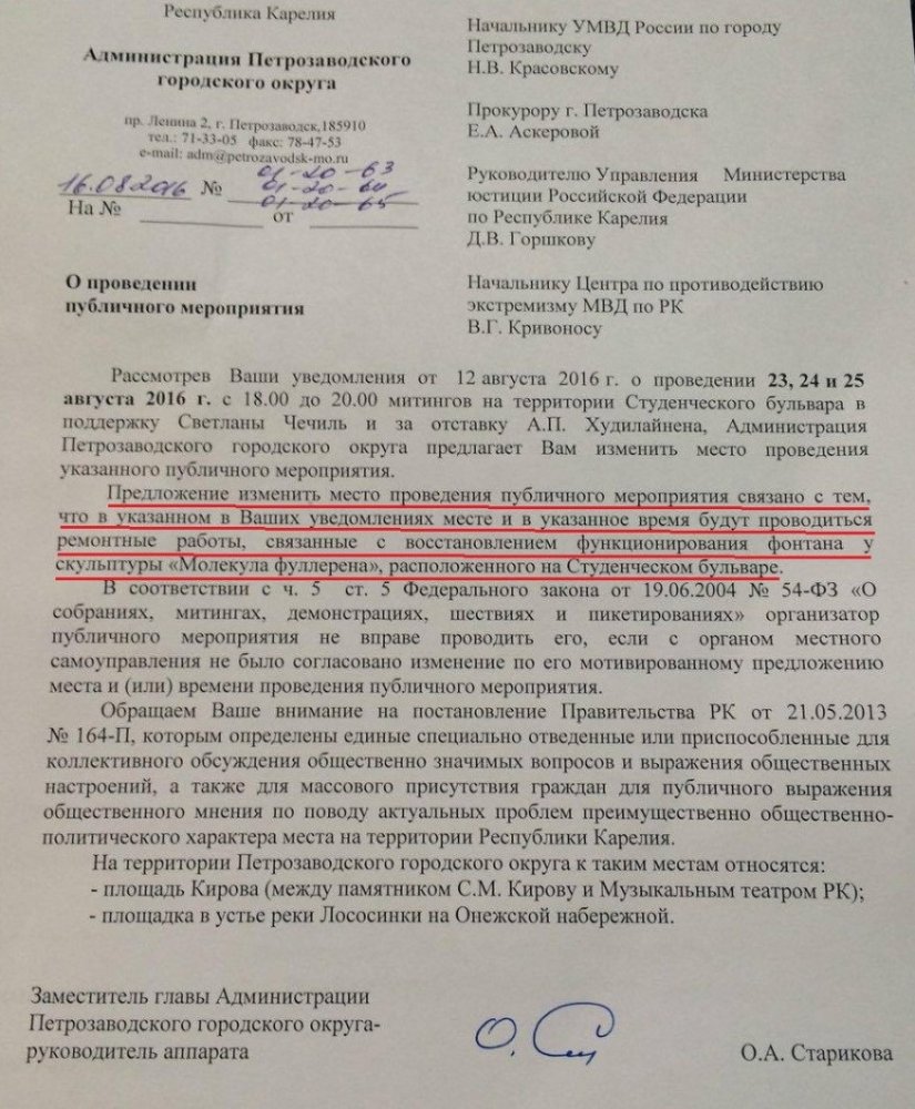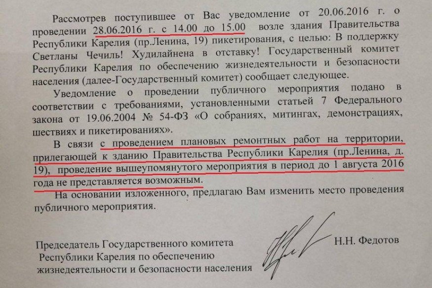28 июня организаторам (заявления пишут члены инициативной группы) отказали в пикете возле здания правительства республики «в связи с проведением плановых ремонтных работы на территории, прилегающей к зданию правительства республики Карелия».