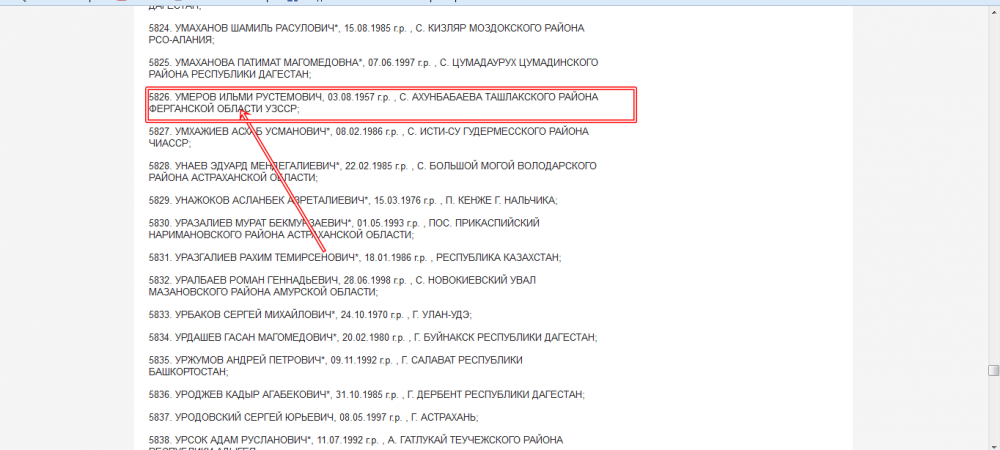 «5826. УМЕРОВ ИЛЬМИ РУСТЕМОВИЧ, 03.08.1957 г.р., С. АХУНБАБАЕВА ТАШЛАКСКОГО РАЙОНА ФЕРГАНСКОЙ ОБЛАСТИ УЗССР», — сказано на сайте Федеральной службы по финансовому мониторингу в разделе «Российские физические лица».