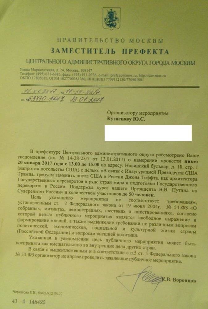 В отказе префектуры сказано, что цель пикета противоречит требованиям федерального закона о митингах и пикетированиях, поскольку, согласно закону, целью публичного мероприятия может быть выражение мнений или даже требований, касающихся жизни Российской Федерации или ее внешней политики. А цель, заявленная организаторами пикета НОД, «может быть воспринята как вмешательство во внутренние дела других стран».