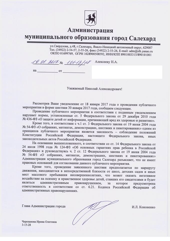 Власти Салехарда не разрешили проведения двух шествий и одного митинга, написал в Facebook организатор гей-прайдов Николай Алексеев. Как и во многих городах, в Салехарде сослались на закон о защите детей от вредной информации. По словам Алексеева, Ямало-Ненецкий автономный округ стал 65-м регионом России, где ЛГБТ-активисты подали уведомления о проведении своих акций с осени 2016 года. Пока ни в одном регионе акции им не согласовали.