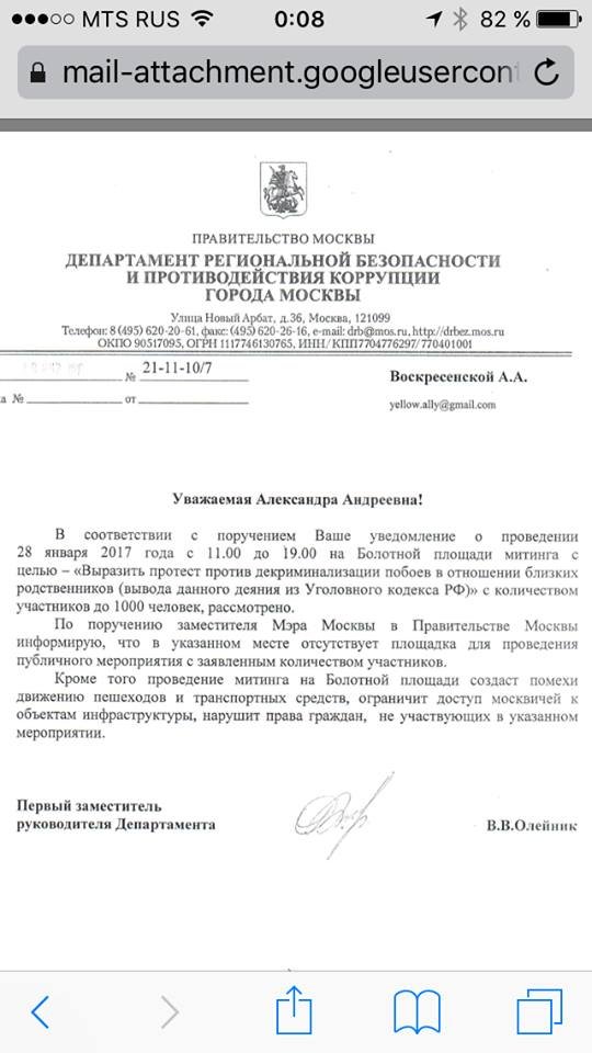 Департамент региональный безопасности Москвы отказал организаторам митинга против декриминализации побоев в отношении близких родственников в согласовании, объяснив это тем, что Болотная площадь не пригодна для проведения публичных мероприятий. Копия документа опубликована 22 января на странице мероприятия в Facebook.