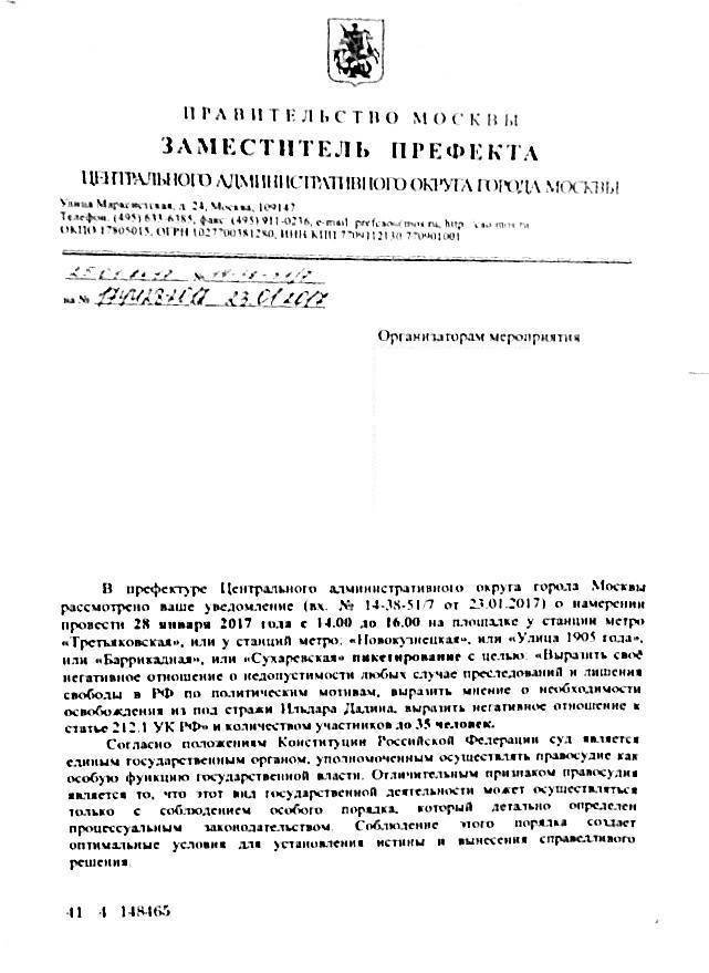 Пикет за освобождение Ильдара Дадина и против политических преследований отказалась согласовать префектура Центрального административного округа Москвы, написала в своем Facebook жена Дадина, Анастасия Зотова. Как следует из ответа префектуры, пикетчики не могут ставить под сомнение непогрешимость работы судов.