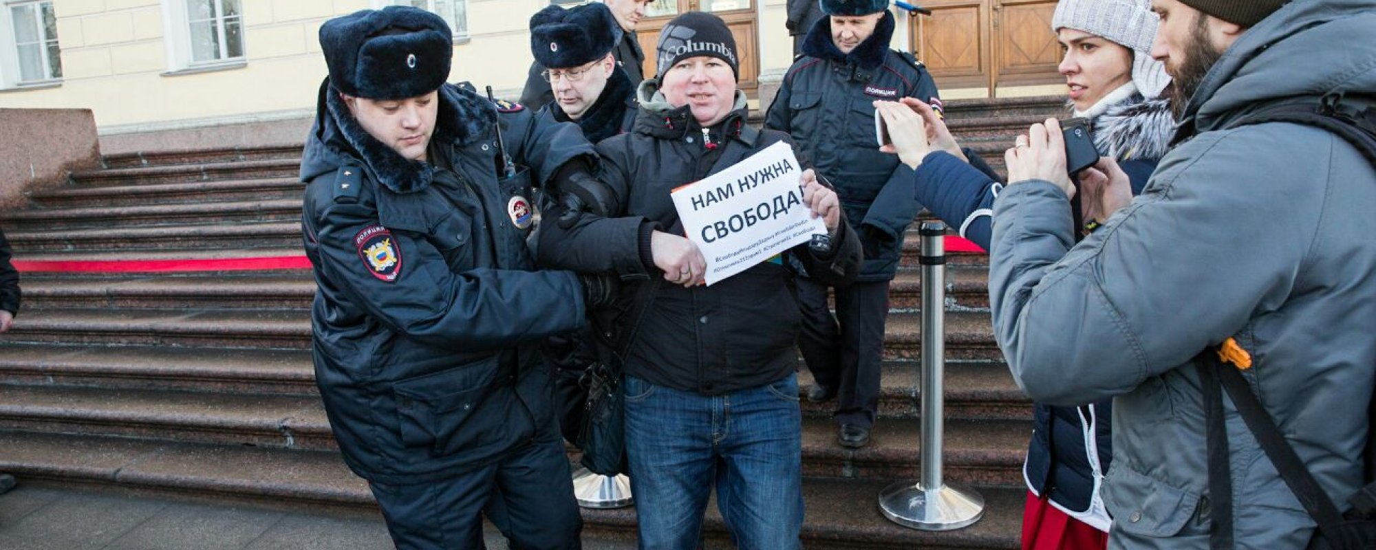 10 февраля возле здания Конституционного суда в Петербурге был задержан активист Динар Идрисов, он держал в руках плакат «Нам нужна свобода». Об этом сообщает «Медиазона» со ссылкой на фотографа Давида Френкеля.