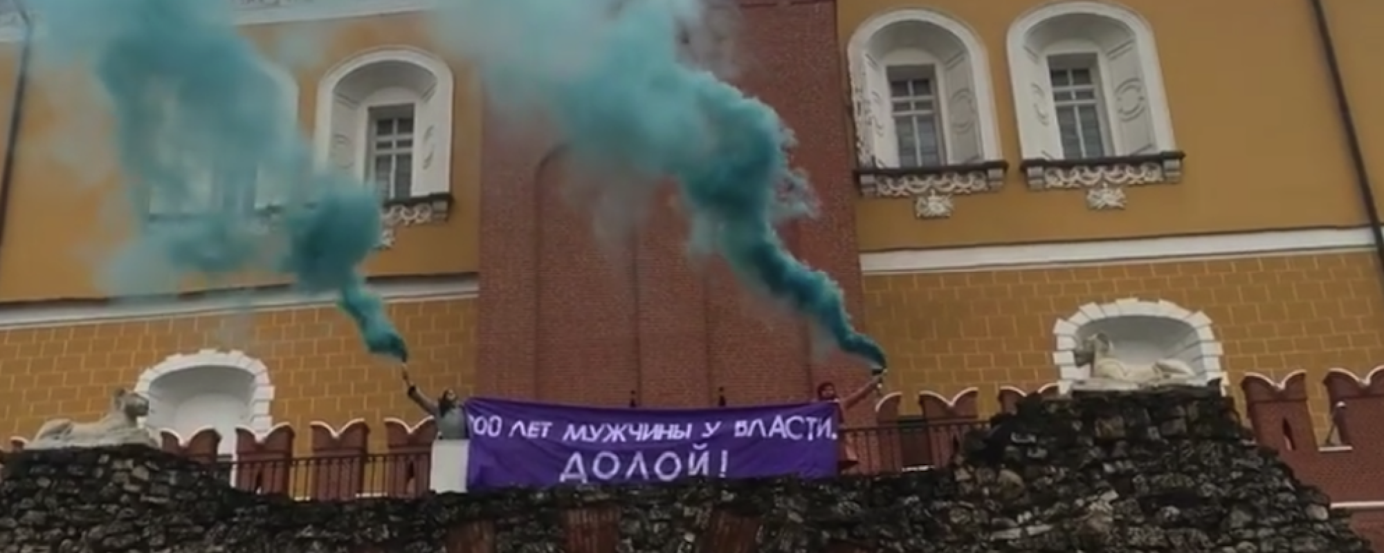 Активистки забрались на стену Кремля со стороны Александровского сада, зажгли дымовые шашки и развернули транспарант «200 лет мужчины у власти. Долой!».
