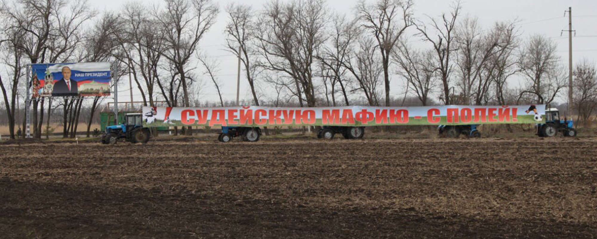 По информации портала Югра.ру, в Кореновский суд в связи с баннером с заявлением о защите чести и достоинства обратился местный футбольный арбитр. Он считает, что баннер «Судейскую мафию — с полей» подрывает его репутацию спортивного судьи.