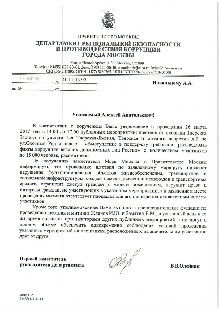 «Любопытная бумага. Это и не согласование, и не отказ. Типа, говорят, что на Тверской места нет, но другое место не предлагают. Хотя по закону нельзя не предложить альтернативе. (…) Пишут, что наше требование „расследовать факты коррупции должностных лиц“ нарушат права и интересы граждан. В общем, мы даже знаем фамилии этих граждан и, безусловно, их интересы очень хотелось бы нарушить. Потому и митингуем», — отмечает Навальный.