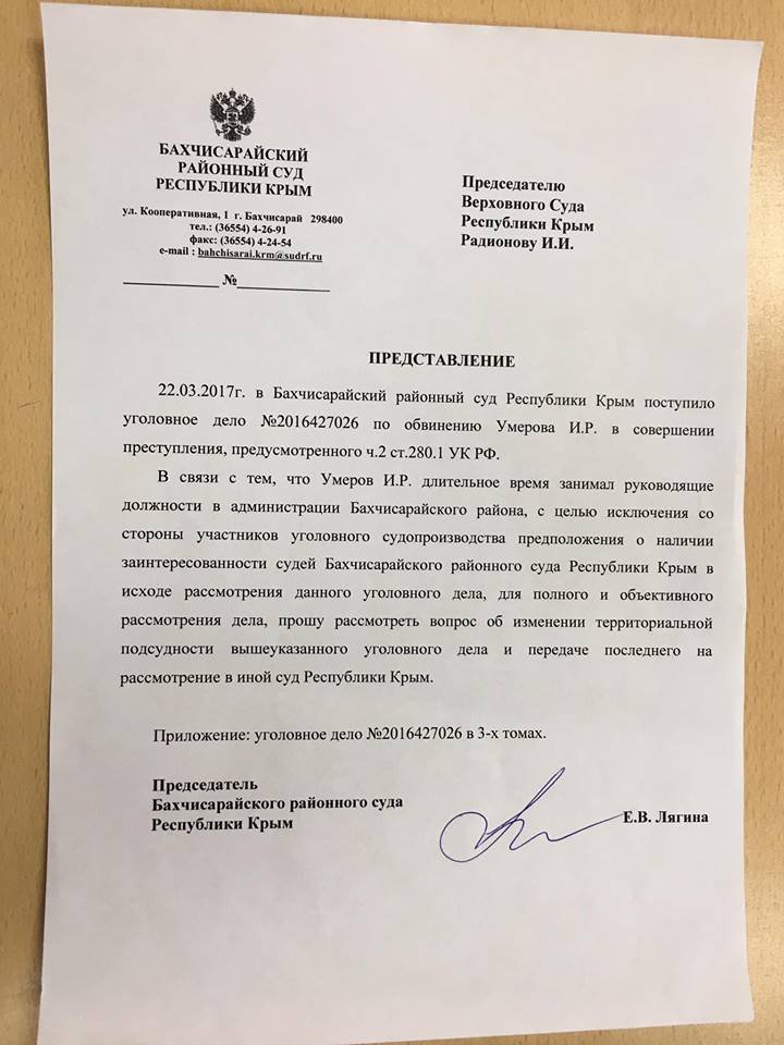 Таким образом Верховный суд Крыма удовлетворил представление Бахчисарайского районного суда, в котором говорилось, что Умеров «длительное время занимал руководящие должности в администрации Бахчисарайского района», поэтому если дело будет рассматриваться в местном суде, у участников процесса могут возникнуть «предположения о наличии заинтересованности судей».