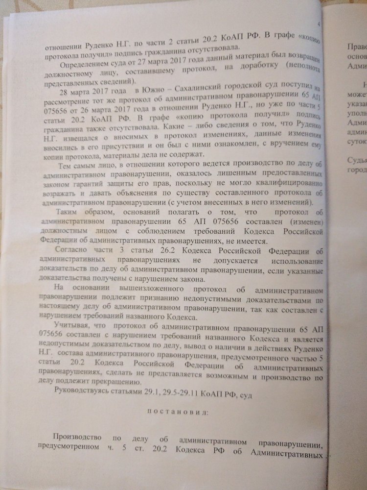 Руденко был задержан 26 марта, когда он прогуливался с плакатом по площади Славы, где проходила несогласованная акция против коррупции. На него был составлен протокол об организации несогласованного мероприятия (ч. 2 ст. 20.2 КоАП). Копию протокола ему не выдали, велели только расписаться и явиться на следующий день в суд. 27 марта в суде, как говорится в постановлении суда, «рассмотрение дела не производилось», и заседание было перенесено на 28 марта. За это время в полиции переделали протокол, поменяв ч. 2 на ч. 5 (нарушение порядка проведения публичного мероприятия, эта часть предполагает менее суровое наказание), и передали протокол в суд. Суд посчитал нужным прекратить дело в отношении Руденко, поскольку тот не был извещен о том, что протокол был изменен.
