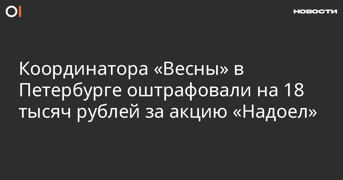 Петроградский районный суд оштрафовал координатора движения «Весна» в Петербурге Николая Артеменко на 18 тысяч рублей за акцию «Надоел» 29 апреля. Об этом сообщает «ЗакС.Ру»