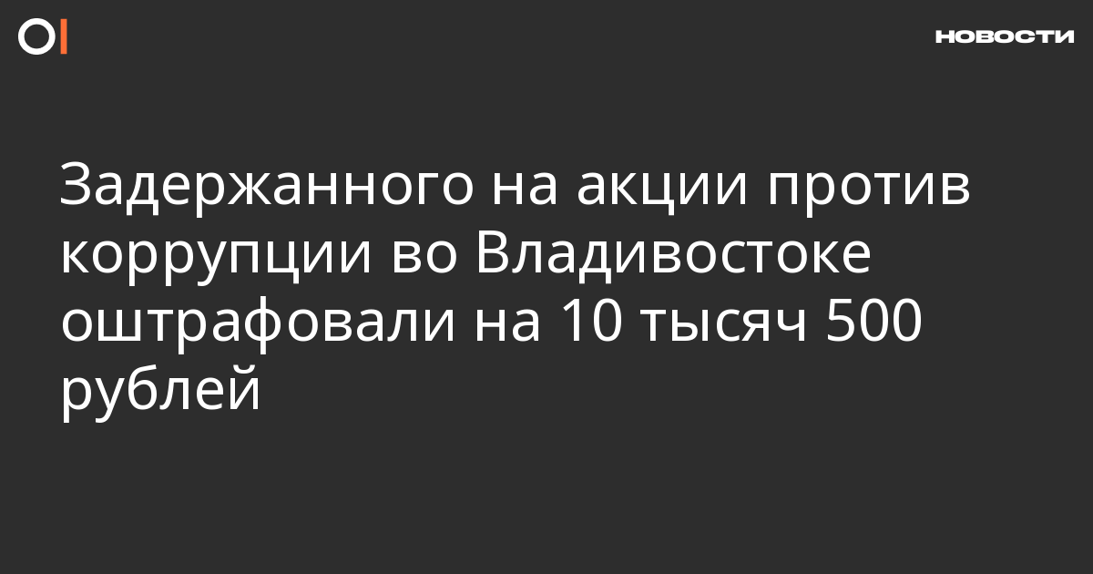 Фрунзенский суд Владивостока 16 июня оштрафовал на 10 тысяч 500 рублей одного из задержанных на митинге против коррупции 12 июня. Владислава Занина признали виновным в нарушении порядка проведения митинга (по части 5 статьи 20.2 КоАП) и неповиновении требованию сотрудника полиции (по статье 19.3 КоАП). При этом сам Занин утверждает, что не знал, что оказался на митинге. Об этом сообщает агентство «PrimaMedia».