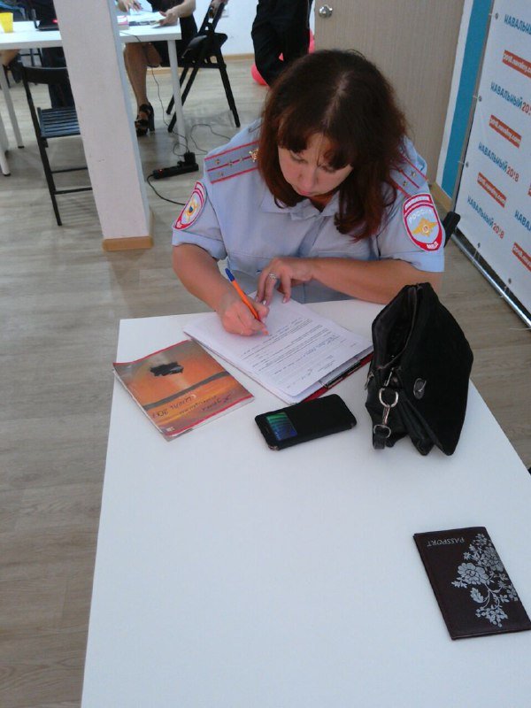 Полицейские провели осмотр штаба, составили подробную опись и изъяли тетрадь, в которую активисты записывают количество посетителей и розданных наклеек с рекламой избирательной кампании Навального.