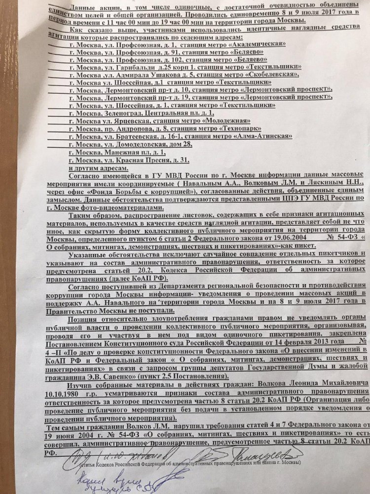 UPD-2: На Леонида Волкова выписали протокол по той же статье. Волков опубликовал фрагмент протокола в твиттере. В документе раздача листовок во время «Протестного субботника» 8 и 9 июля названа «скрытой формой коллективного публичного мероприятия».