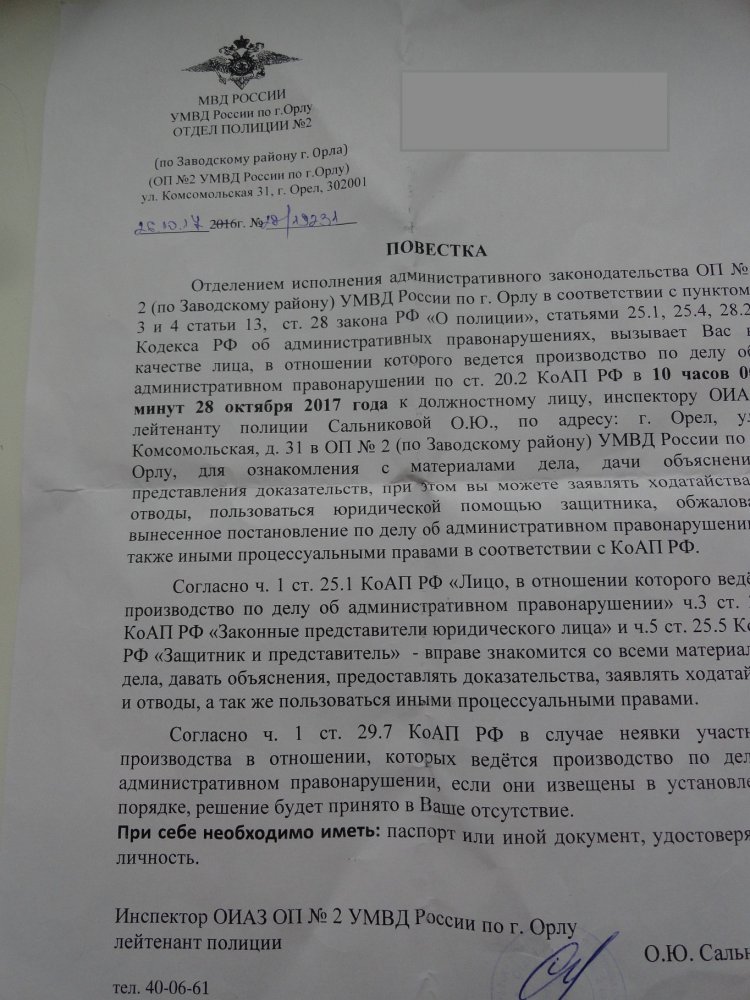 Волонтерам предвыборного штаба Алексея Навального в Орле приходят повестки, в которых от них требуют явиться в отдел полиции № 2 по Заводскому району для составления протокола о нарушении порядка проведения публичных мероприятий. Об этом сообщается на странице «Команда Навального | Орел» в соцсети «ВКонтакте».