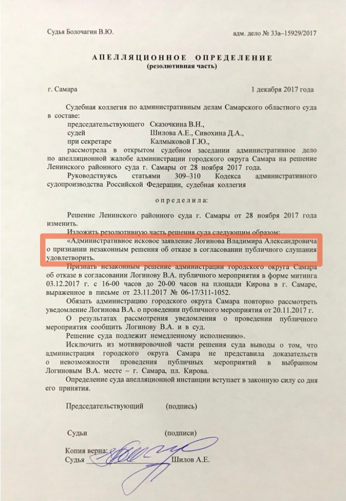 Сотрудники штаба обжаловали решение чиновников. В результате Ленинский районный суд признал отказ в согласовании необоснованным. После представители администрации подали апелляцию на решение суда первой инстанции, но Самарский областной суд ее отклонил, и обязал властей устранить нарушения.